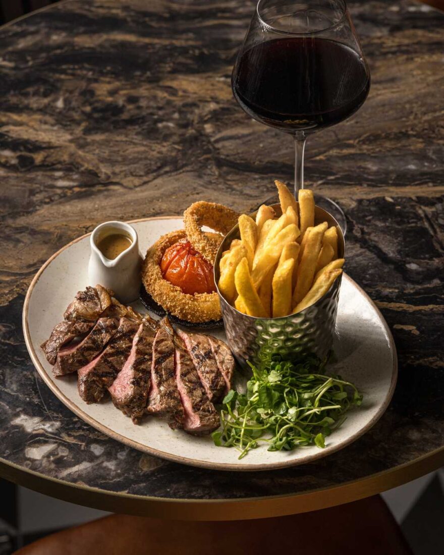 Rump steak cooked to perfection and a stack of thick cut chips with mushroom and tomato and a bottle of wine* for two people is £49 – with other menu options if you’re not a fan of steak.